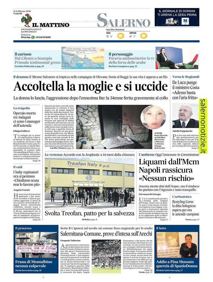 Accoltella la moglie e si uccide. La donna lo lascia, l’aggressione dopo l’ennesima lite: la 34enne ferita gravemente al collo. Il dramma. Il 38enne Salvatore si impicca nelle campagne di Olevano. Sonia al Ruggi: la sua vita è appesa a un filo