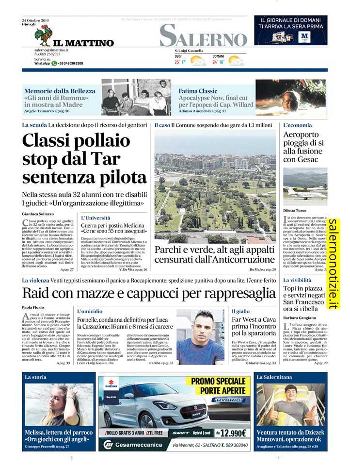 A centro pagina: Raid con mazze e cappucci per rappresaglia. La violenza. Venti teppisti seminano il panico a Roccapiemonte: spedizione punitiva dopo una lite, 17enne ferito