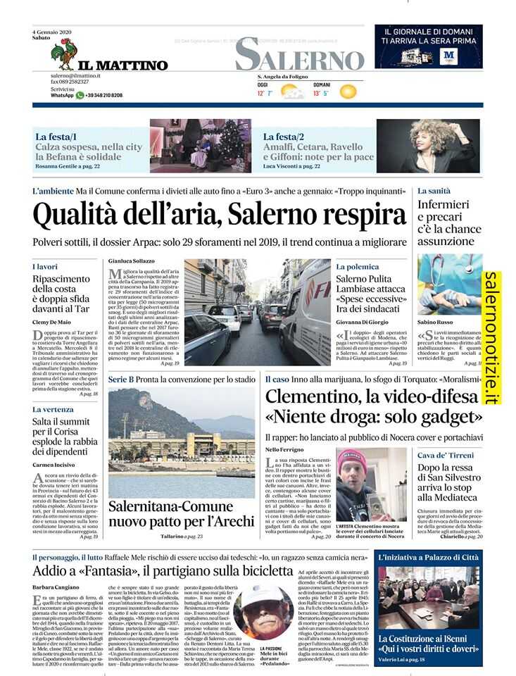 A centro pagina: Clementino, la video-difesa «Niente droga: solo gadget». Il rapper: ho lanciato al pubblico di Nocera cover e portachiavi. Il caso. Inno alla marijuana, lo sfogo di Torquato: «Moralismi»