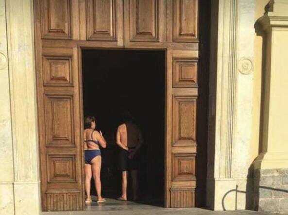 Nello scatto, che risale a domenica scorsa e che è stato proposto dal Corriere della Sera on line, si vedono chiaramente due turisti di spalle che entrano, in costume, nella chiesa della Madonna di Portosalvo, Villammare, vicino Sapri. Ostia: verrebbe da esclamare. Agnello di Dio che toglie i peccati del mondo, abbi pietà del look, fin troppo succinto e vacanziero, decisamente non consono alle leggi della chiesa e a quei parroci che vanno in bestia appena vedono donne scosciate e scollate (ma poi vanno in bestia in che senso?)