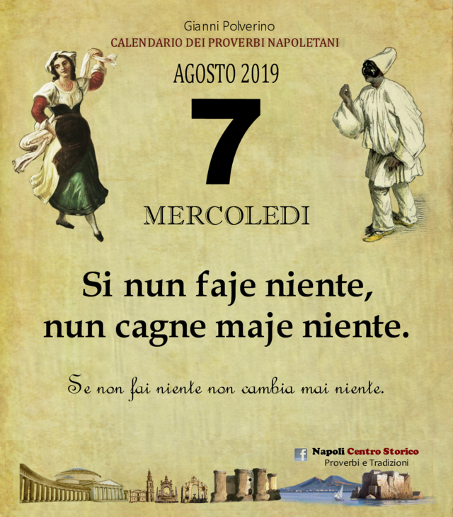 NewsIl Proverbio del giornoDi redazione mn24 - 7 Agosto 2019067FacebookTwitterPinterestWhatsApp Si nun faje niente, nun cagne maje niente. Se non fai niente non cambia mai niente.