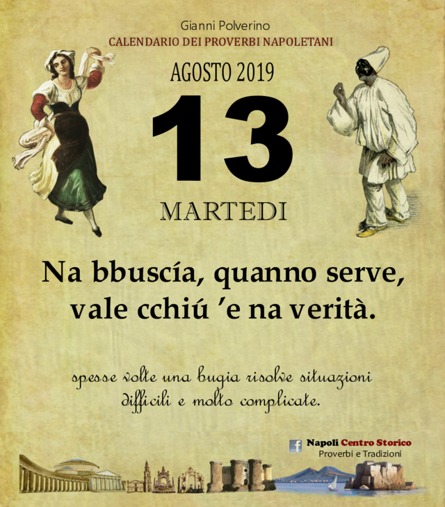 NewsIl Proverbio del giornoDi redazione mn24 - 13 Agosto 2019063FacebookTwitterPinterestWhatsApp Na bbuscía, quanno serve, vale cchiú ’e na verità. spesse volte una bugia risolve situazioni difficili e molto complicate.