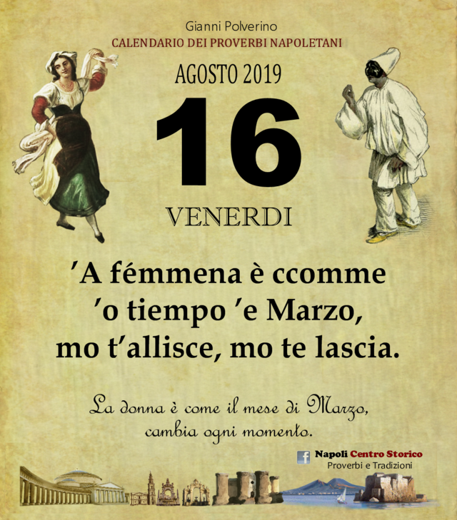 NewsIl Proverbio del giornoDi redazione mn24 - 16 Agosto 2019058FacebookTwitterPinterestWhatsApp A fémmena è ccomme ’o tiempo ’e Marzo, mo t’allisce, mo te lascia. La donna è come il mese di Marzo, cambia ogni momento.