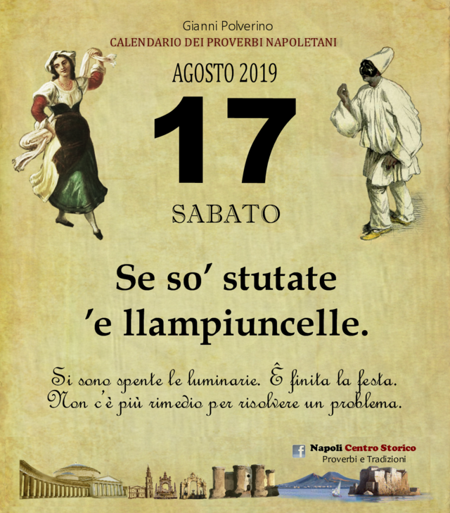 NewsIl Proverbio del giornoDi redazione mn24 - 17 Agosto 2019087FacebookTwitterPinterestWhatsApp Se so’ stutate ’e llampiuncelle. Si sono spente le luminarie. Ê finita la festa. Non c’è più rimedio per risolvere un problema.