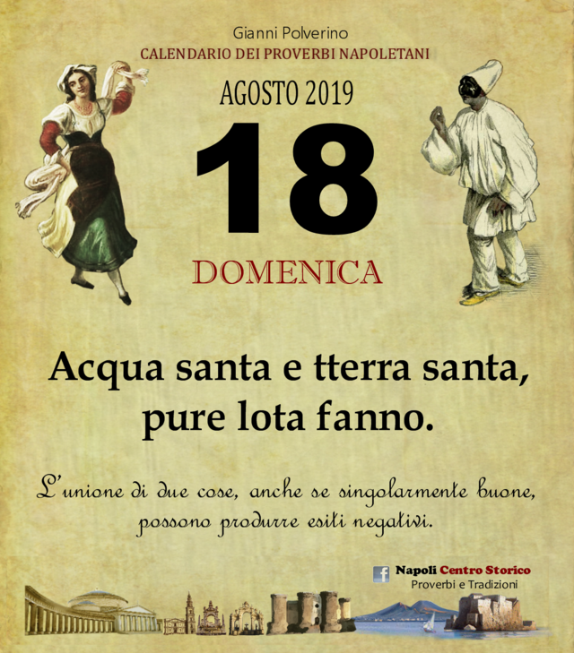 NewsIl Proverbio del giornoDi redazione mn24 - 18 Agosto 2019077FacebookTwitterPinterestWhatsApp Acqua santa e tterra santa, pure lota fanno. L’unione di due cose, anche se singolarmente buone, possono produrre esiti negativi.