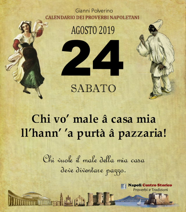NewsIl Proverbio del giornoDi redazione mn24 - 24 Agosto 2019072FacebookTwitterPinterestWhatsApp Chi vo’ male â casa mia ll’hann’ ’a purtà â pazzaria! Chi vuole il male della mia casa deve diventare pazzo.