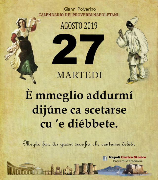 NewsIl Proverbio del giornoDi redazione mn24 - 27 Agosto 2019038FacebookTwitterPinterestWhatsApp È mmeglio addurmí dijúne ca scetarse cu ’e diébbete.Meglio fare dei grossi sacrifici che contrarre debiti.