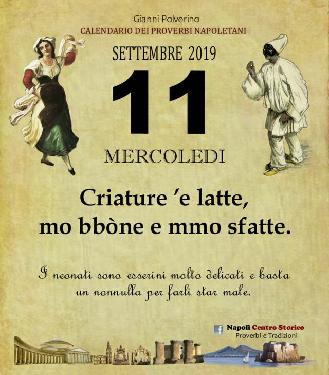 NewsIl Proverbio del giornoDi redazione mn24 - 11 Settembre 2019046FacebookTwitterPinterestWhatsApp Criature ’e latte, mo bbòne e mmo sfatte. I neonati sono esserini molto delicati e basta un nonnulla per farli star male