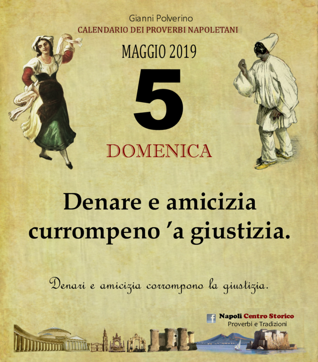 NewsIl Proverbio del giornoDi redazione mn24 - 5 Maggio 2019058FacebookTwitterPinterestWhatsApp Denare e amicizia currompeno ’a giustizia. Denari e amicizia corrompono la giustizia.
