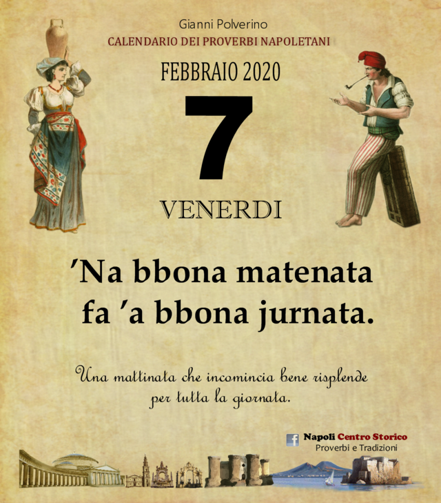 NewsIl proverbio del giornoDi redazione mn24 - 7 Febbraio 2020043FacebookTwitterPinterestWhatsApp Na bbona matenata fa ’a bbona jurnata. Una mattinata che incomincia bene risplende per tutta la giornata.