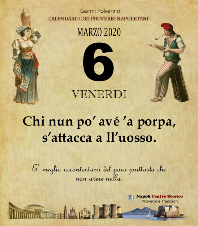 NewsIl Proverbio del giornoDi redazione mn24 - 6 Marzo 20200185FacebookTwitterPinterestWhatsApp Chi nun po’ avé ’a porpa, s’attacca a ll’uosso. E’ meglio accontentarsi del “poco“piuttosto che non avere nulla.