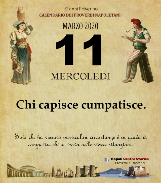 NewsIl Proverbio del giornoDi redazione mn24 - 11 Marzo 20200108FacebookTwitterPinterestWhatsApp Chi capisce cumpatisce. Solo chi ha vissuto particolari circostanze è in grado di compatire chi si trova nelle stesse situazioni.