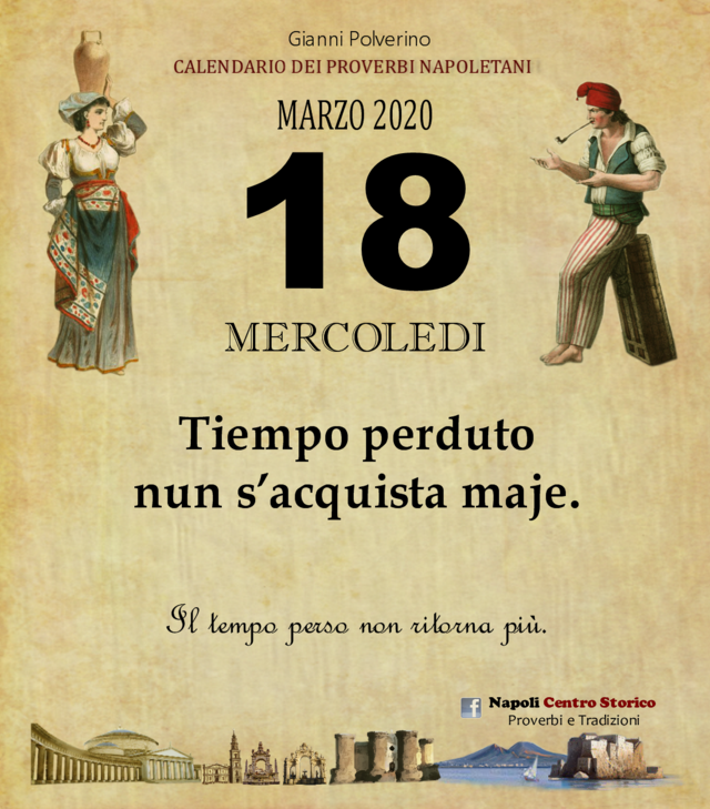 NewsIl Proverbio del giornoDi redazione mn24 - 18 Marzo 20200143FacebookTwitterPinterestWhatsApp Tiempo perduto nun s’acquista maje. Il tempo perso non ritorna più.