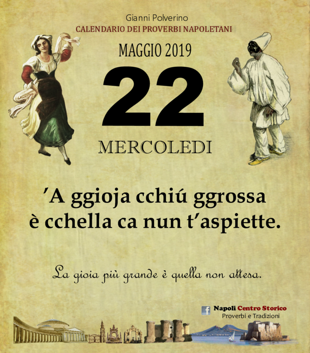 NewsIl Proverbio del giornoDi redazione mn24 - 22 Maggio 2019061FacebookTwitterPinterestWhatsApp A ggioja cchiú ggrossa è cchella ca nun t’aspiette. La gioia più grande è quella non attesa