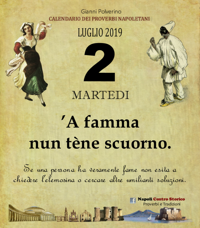 NewsIl proverbio del giornoDi redazione mn24 - 2 Luglio 2019072FacebookTwitterPinterestWhatsApp ’A famma nun tène scuorno. Se una persona ha veramente fame non esita a chiedere l’elemosina o cercare altre umilianti soluzioni.