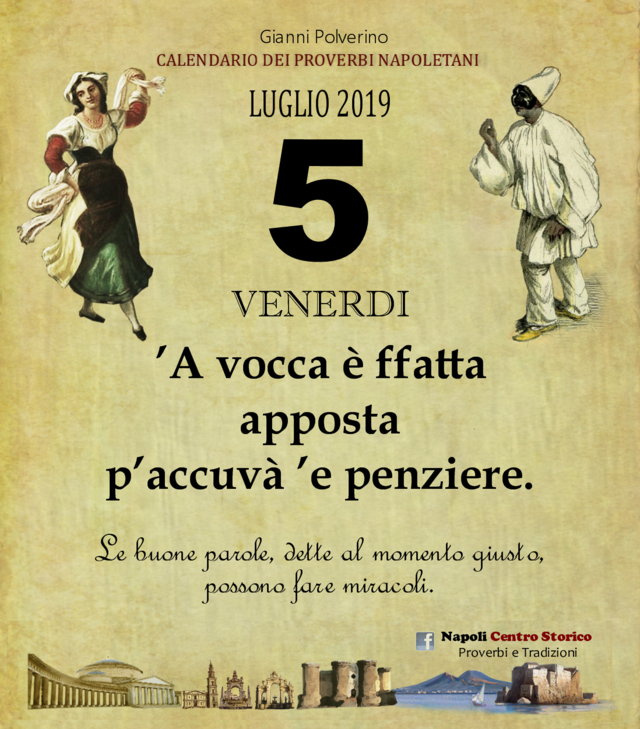 NewsIl Proverbio del giornoDi redazione mn24 - 5 Luglio 2019049FacebookTwitterPinterestWhatsApp A vocca è ffatta apposta p’accuvà ’e penziere. Le buone parole, dette al momento giusto, possono fare miracoli.