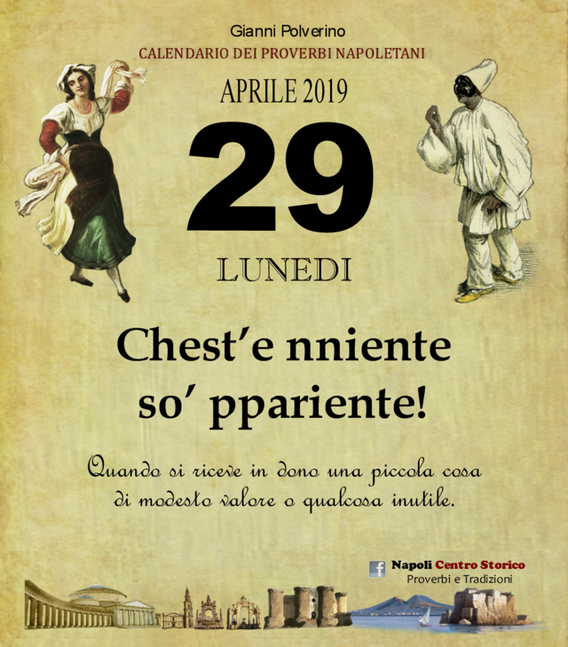 NewsIl Proverbio del giornoDi redazione mn24 - 29 Aprile 2019067FacebookTwitterPinterestWhatsApp Chest’e nniente so’ ppariente! Quando si riceve in dono una piccola cosa di modesto valore o qualcosa inutile.