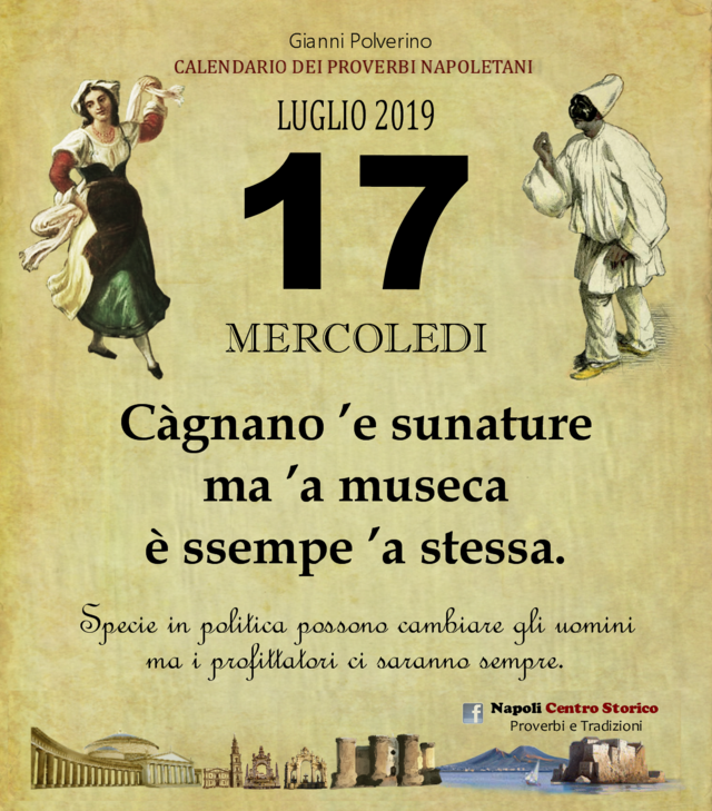 NewsIl Proverbio del giornoDi redazione mn24 - 17 Luglio 2019075FacebookTwitterPinterestWhatsApp Càgnano ’e sunature ma ’a museca è ssempe ’a stessa. Specie in politica possono cambiare gli uomini ma i profittatori ci saranno sempre.