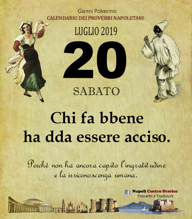 NewsIl Proverbio del giornoDi redazione mn24 - 20 Luglio 2019073FacebookTwitterPinterestWhatsApp Chi fa bbene ha dda essere acciso. Perchè non ha ancora capito l‘ingratitudine e la irriconoscenza umana.