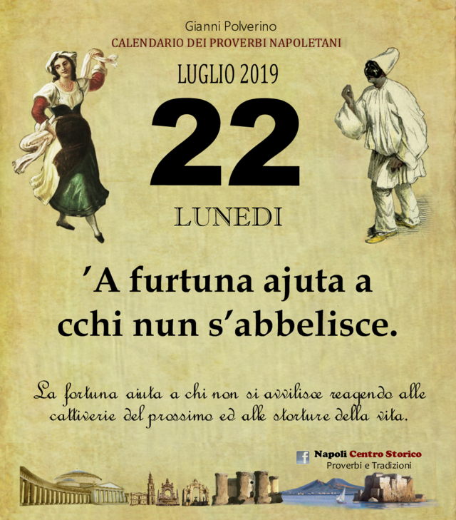 NewsIl Proverbio del giornoDi redazione mn24 - 22 Luglio 20190173FacebookTwitterPinterestWhatsApp ’A furtuna ajuta a cchi nun s’abbelisce. La fortuna aiuta a chi non si avvilisce reagendo alle cattiverie del prossimo ed alle storture della vita.
