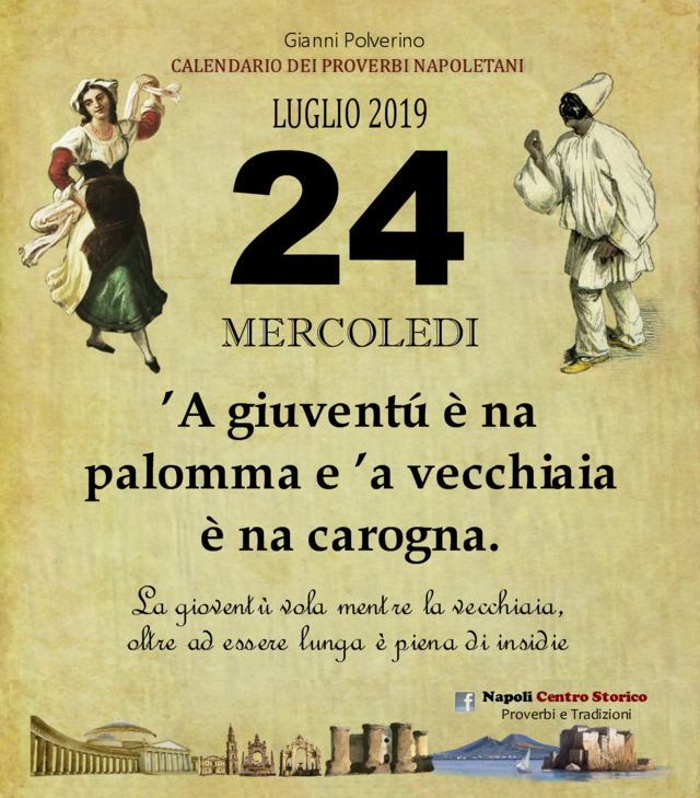 NewsIl Proverbio del giornoDi redazione mn24 - 24 Luglio 2019045FacebookTwitterPinterestWhatsApp ’A giuventú è na palomma e ’a vecchiaia è na carogna. La gioventù vola mentre la vecchiaia, oltre ad essere lunga è piena di insidie