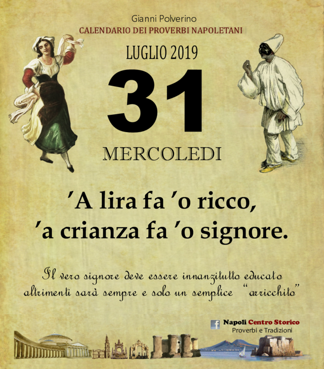 NewsIl Proverbio del giornoDi redazione mn24 - 31 Luglio 2019062FacebookTwitterPinterestWhatsApp ’A lira fa ’o ricco, ’a crianza fa ’o signore. Il vero signore deve essere innanzitutto educato altrimenti sarà sempre e solo un semplice “arricchito”