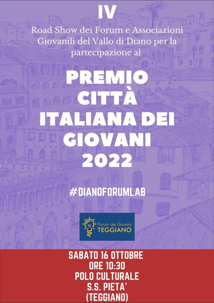ha l’ambizione di concorrere al Premio Città Italiana dei Giovani 2022 emanato dalla Presidenza de l Consiglio dei Ministri Dipartimento per le Politiche Giovanili e dal Consiglio Nazionale dei Giovani, con una proposta condivisa nell’ambito della quale i giovani dei Forum aderenti al progetto hanno individuato la Città di Sala Consilina rappresentata dall’Assessore alle Politiche Giovanili, al Turismo e Cultura Francesco Spinelli e dal Forum di Sala presieduto da Vincenzo Esposito le strutture capofila per la candidatura al Premio. L’incontro di Teggiano, fortemente voluto dal Presidente del locale Forum Rocco De Paola, continuerà il proprio iter con l’attività di progettazione condivisa tesa a definire azioni ed interventi funzionali alle esigenze di aggregazione istituzionale e programmatica tra gli enti e il sistema economico e sociale del Vallo di Diano.