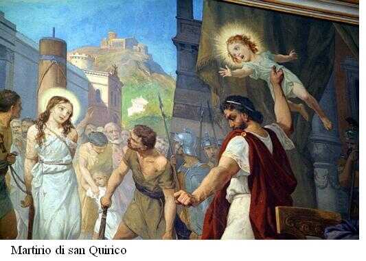 Nel frattempo, il governatore Alessandro, fatto togliere il fanciullo alla madre, lo teneva sulle sue ginocchia. Ma, per quanti sforzi facesse il governatore per distogliere gli occhi del fanciullo dal guardar la madre, il piccolo continuava a tenere gli occhi rivolti verso di lei ed a gridare ‘Io sono cristiano’. Quindi prese per un piede il piccolo Quirico, e lo scagliò furente al suolo, dinanzi agli occhi della madre.
