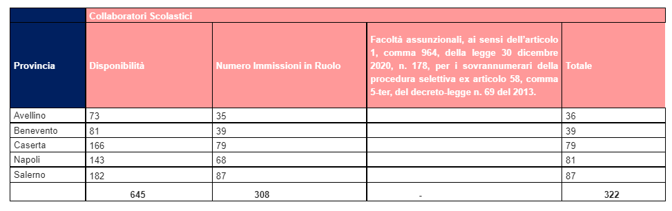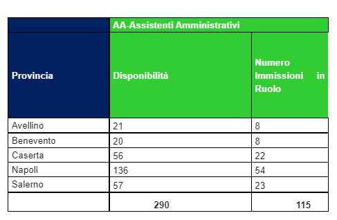 Nell’incontro di oggi l’USR Campania ha affermato che le immissioni in ruolo per il personale ATA inizieranno in data odierna con la scelta della provincia da parte dei candidati DSGA. I posti in ruolo saranno 142 e non 164 come i posti liberi poiché si assumerà nelle scuole con almeno 600 alunni o con 400 alunni nelle zone montane. Anche se la legge di bilancio di quest’anno ha permesso alle istituzioni scolastiche di conservare l’autonomia in deroga alla normativa vigente con almeno 500 alunni o 300 nelle zone montane, però, tali scuole vengono considerate comunque sottodimensionate pertanto non possono essere considerate libere per le immissioni in ruolo di DSGA ma in reggenza.