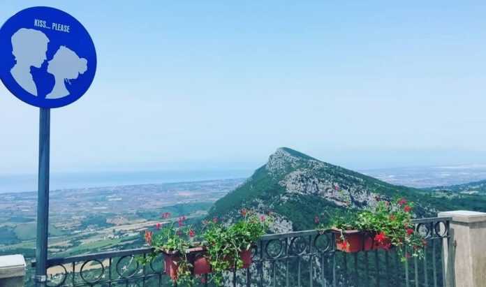 In primo piano la montagna, poi una distesa verde e in fondo, lungo l’orizzonte, il mare del Cilento. Due profili che quasi si sfiorano ed una scritta: Kiss please. Nel profilo del cartello raffigurati Isabella e Saul, due giovani amanti protagonisti di una famosa leggenda legata proprio a questi luoghi.