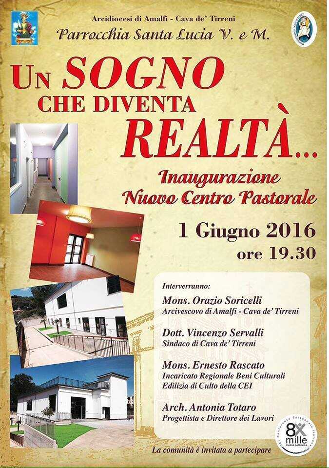 Domani, mercoledì 1 giugno 2016, alle ore 19.30, è prevista l’inaugurazione del nuovo centro pastorale della parrocchia di Santa Lucia, guidata da Don Beniamino D’Arco.