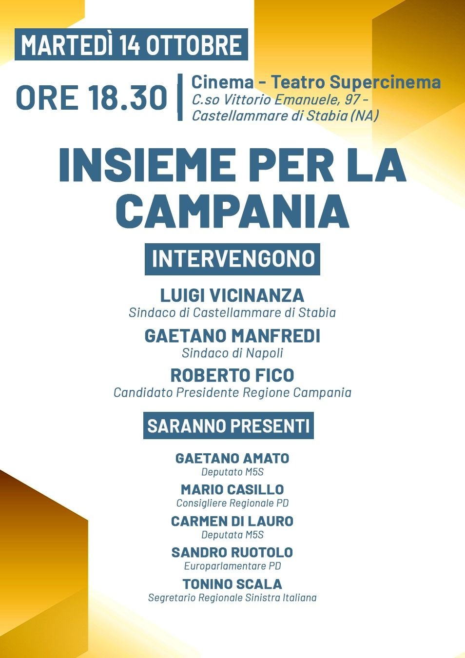 A intervenire saranno Luigi Vicinanza, sindaco di Castellammare di Stabia, Gaetano Manfredi, sindaco di Napoli, e Roberto Fico, candidato alla presidenza della Regione Campania.