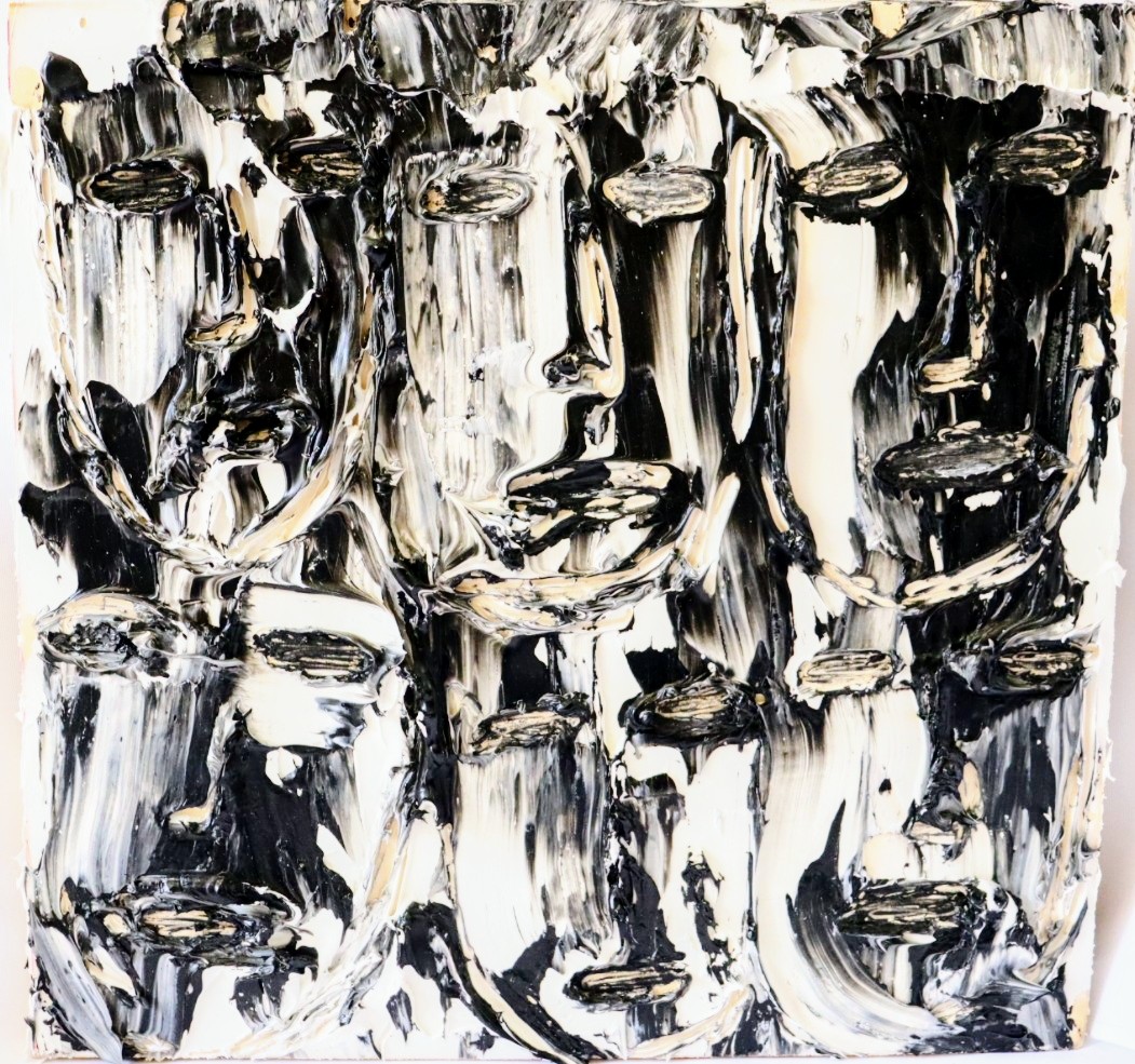 Volti appena accennati, quasi maschere tribali, si fondono a oggetti in decadenza, come i libri, in una denuncia potente, più eloquente dei graffiti di Basquiat e più urlante dell’urlo di Munch. Una potenza che, come ha scritto Marco Visconti, è urgenza.