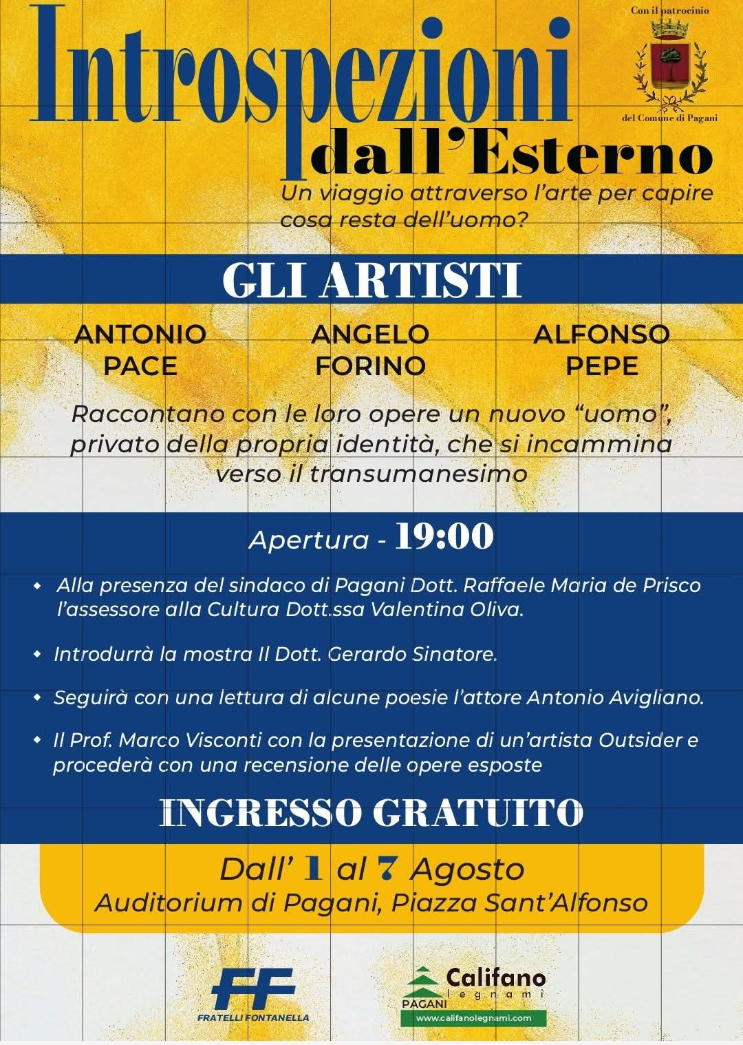 Scrivere senza passione mi è impossibile, soprattutto quando si tratta di Arte e Politica. Ho bisogno di una forte motivazione per farlo, e in questo caso la trovo nelle qualità personali e comunicative di tre amici artisti: Antonio Pace (per me, Apax), Alfonso Pepe e Angelo Forino, nel tema che farà da filo conduttore alla mostra in programma il 1° agosto presso l’Auditorium Comunale Sant’Alfonso di Pagani, promossa dal Comune: “Introspezioni dall’Esterno. Che cosa resta dell’uomo che si incammina verso il Transumanismo?”.