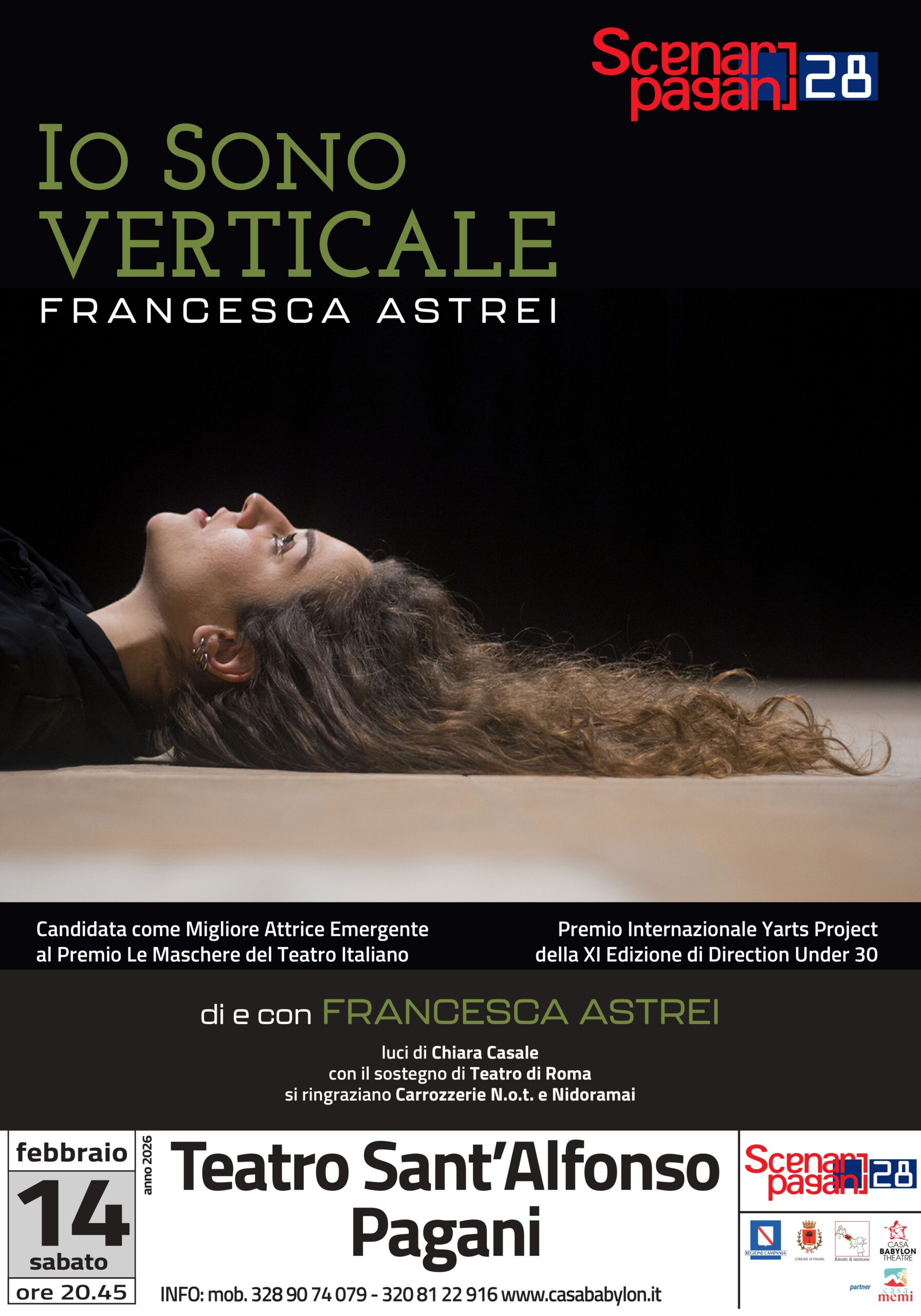 Il sipario di “Scenari pagani 28” si apre nel giorno dedicato all’amore per un appuntamento che promette di scavare nelle profondità dell’anima. Il 14 febbraio, alle ore 20:45, l’Auditorium “Sant’Alfonso” accoglie Francesca Astrei con il suo intenso spettacolo “Io sono verticale”. L’opera arriva a questo quarto incontro della rassegna con un palmarès d’eccezione, avendo conquistato il Premio Ubu come miglior attrice under 35, il premio della giuria Direction Under 30 e il Premio Yarts Project. La produzione, sostenuta dal Teatro di Roma in collaborazione con Carrozzerie N.o.t. e Nidoramai e arricchita dalle luci di Chiara Casale, offre uno sguardo unico su un tema delicato e universale. L’esperienza inizierà già prima dello spettacolo con il consueto AperiSpettacolo curato da Ritratti di territorio, che vedrà protagoniste le eccellenze artigiane di Pepe Mastro Dolciere e Famiglia Pagano 1968. In questa intervista, Francesca Astrei ci conduce dietro le quinte del suo lavoro, tra riflessioni filosofiche e sfide attoriali.