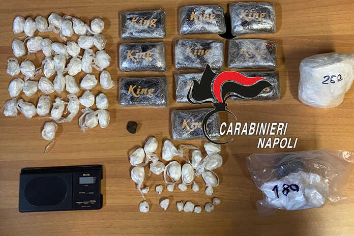 Durante una perquisizione domiciliare è stato trovato in possesso di 1 chilo di hashish, suddiviso in 10 panetti con il marchio “King”, 750 grammi di cocaina e un bilancino di precisione.