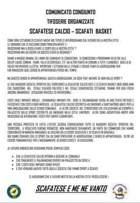 La Scafati sportiva tutta adesso chiede chiarezza. Ad unire gli animi è il tifo organizzato della Scafati calcistica e cestistica. Entrambe le realtà, oltre al risultato agonistico non eccellente, recriminano una scarsa programmazione e solidità di progetto.