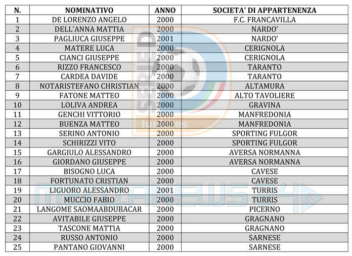 Continuano i raduni delle Rappresentative Juniores dei 9 gironi di Serie D, in vista del nuovo appuntamento con la Juniores Cup organizzata dalla Lega Nazionale Dilettanti. La Campania si conferma ottimo “serbatoio” per la squadra del girone H, affidata alla guida tecnica di Biagio Peluso. Qui di seguito l’elenco dei convocati per l’amichevole in programma mercoledì 11 aprile, allo stadio “Vicino”, con la formazione Juniores del Gravina.