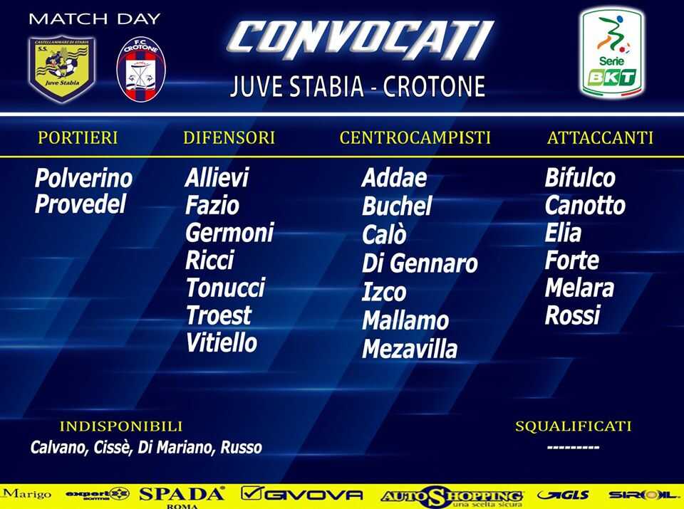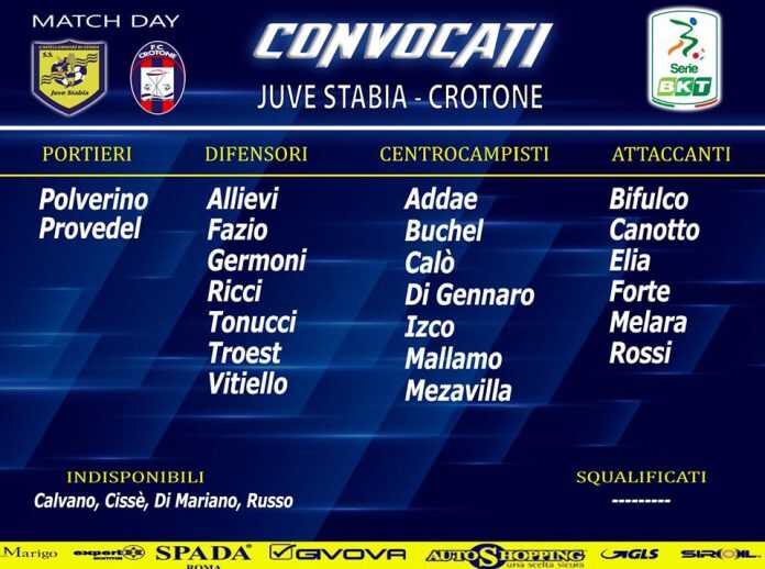 Al termine dell’allenamento di rifinitura, svolto questa mattina presso lo Stadio “Romeo Menti”, il tecnico Fabio Caserta ha reso nota la lista dei 22 calciatori convocati per il match Juve Stabia – Crotone, valevole per la 24^ giornata del Campionato di Serie BKT, in programma domani, 15 febbraio 2020, con inizio alle ore 15 presso lo stadio “Romeo Menti” di Castellammare di Stabia.