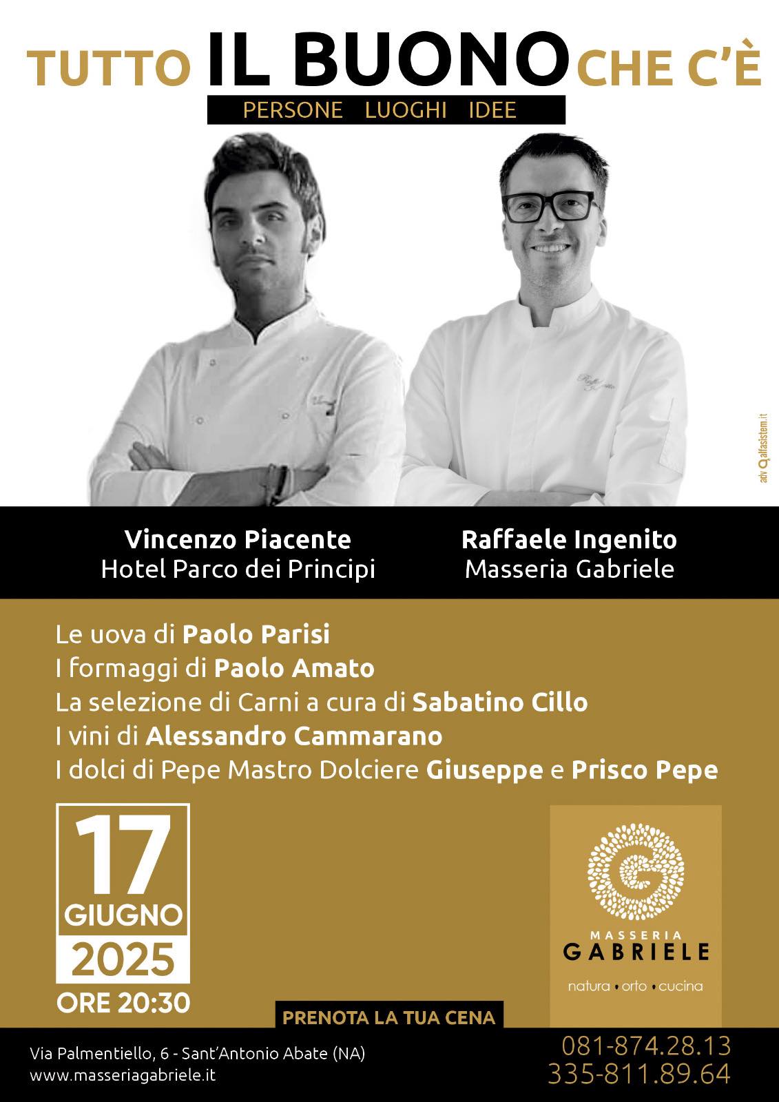 La Masseria Gabriele, immersa in un meraviglioso giardino di agrumi e circondata da un ampio parco verde, si trova nella zona collinare di Sant’Antonio Abate ai piedi dei Monti Lattari. La cucina racconta antichi sapori di casa e piaceri luculliani dei giorni di festa, con un perfetto equilibrio tra tradizione e innovazione e un’attenzione particolare alla stagionalità e alla qualità delle materie prime. il menù della serata prevede un entrée con i formaggi di Paolo Amato del Caseificio Aurora, la selezione di carni e salumi di Sabatino Cillo, la “Fantasia di uova” di Paolo Parisi e le bollicine di Vigne Storte. L’antipasto propone “Un po’ di morbido”, un uovo morbido con zuppetta di provolone podolico agli agrumi, cipollotto nocerino e mela verde curato dallo chef Vincenzo Piacente. Come primo piatto, “O tubbettiell… ‘ca cerasa!”, tubettino del Pastificio Caccese con cremoso di blu di bufala del Caseificio Aurora e insalatina di ciliegie della Masseria, firmato dallo chef Raffaele Ingenito. Il secondo piatto, “Come le grigliate di una volta… ma più buone?”, propone picanha affumicata, maialino e altre prelibatezze alla brace con contorni tipici del barbecue americano rivisitati in chiave mediterranea, con la selezione a cura di Sabatino Cillo. La serata si concluderà in dolcezza con la piccola pasticceria e le graffe fritte della Pasticceria Pepe Mastro Dolciere.