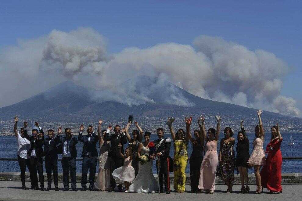 Titanic. Ballavano mentre affondava. Sposi, con immancabile foto di gruppo (nei nostri tempi moderni, rito irrinunciabile). Vesuvio in fiamme? Cosa importa, c’è il matrimonio: oggi si avvera il sogno e siamo sposi. Di una gioventù bruciata, con un amore di secondo mano (forse). Su dai, anche i fuochi pirotecnici. Riso amaro, molto.