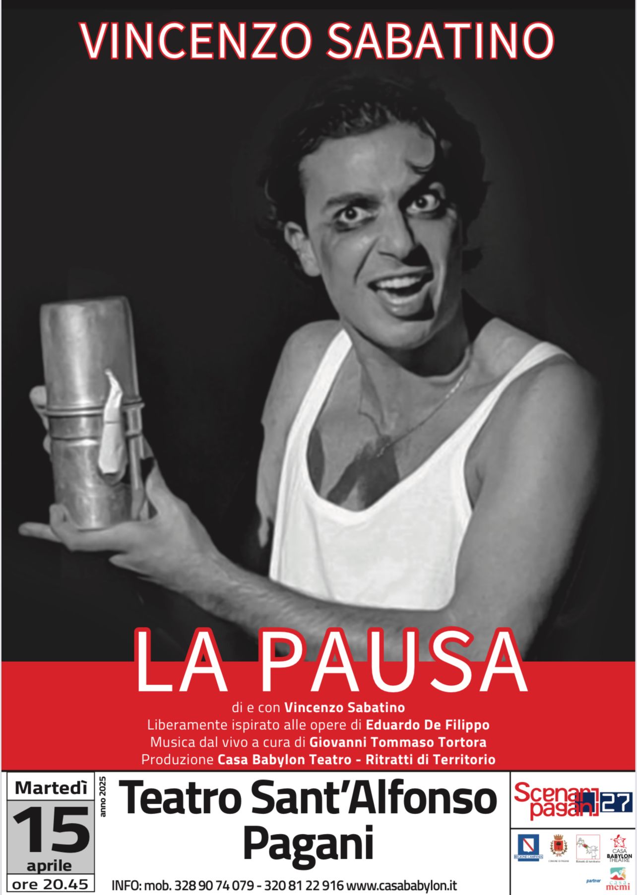 La stagione teatrale 2024-2025 di Casa Babylon si conclude con un grande evento al Teatro Sant’ Alfonso di Pagani. Martedì 15 aprile, la rassegna “Scenari pagani 27 – Fuori Campo” saluterà il pubblico con “La Pausa“, uno spettacolo scritto e interpretato dal giovane Vincenzo Sabatino. La scelta di chiudere la stagione con questo lavoro rappresenta un omaggio al grande Eduardo De Filippo e al talento emergente di Sabatino, un attore che ha iniziato il suo percorso teatrale proprio all’interno del laboratorio di Casa Babylon.
