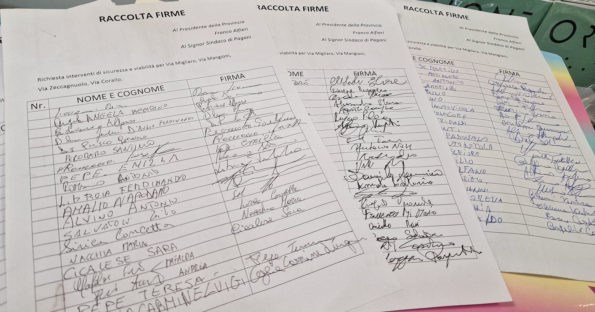 Già in poche ore ha ottenuto svariate firme dai cittadini residenti nelle già dette strade. Spiega D’Onofrio, «abbiamo attivato una serie di cittadini residenti per le strade, oggetto della petizione, per raccogliere firme in modo da sensibilizzare le autorità che hanno competenze per queste strade: ovvero la Provincia e il Comune di Pagani».