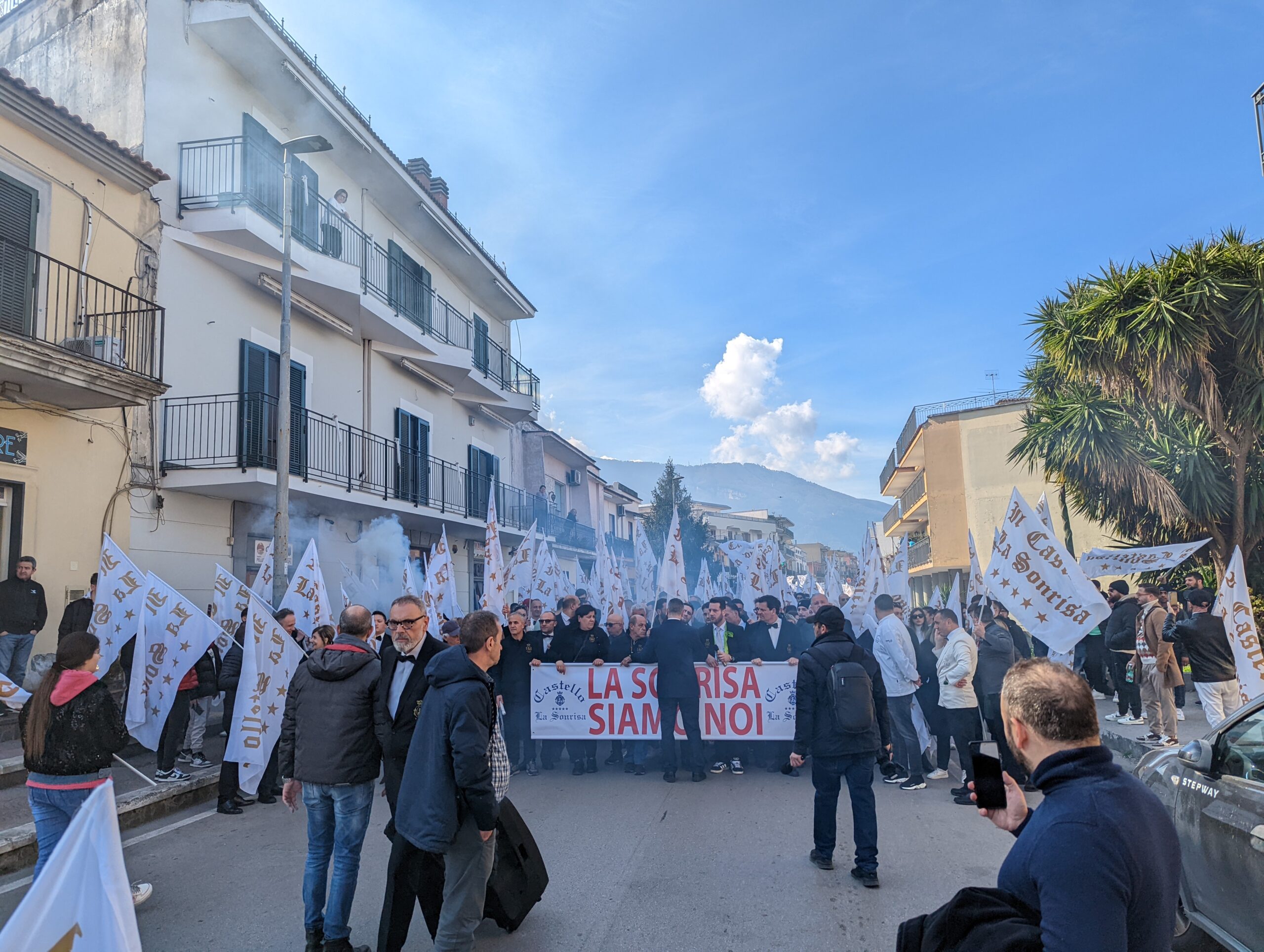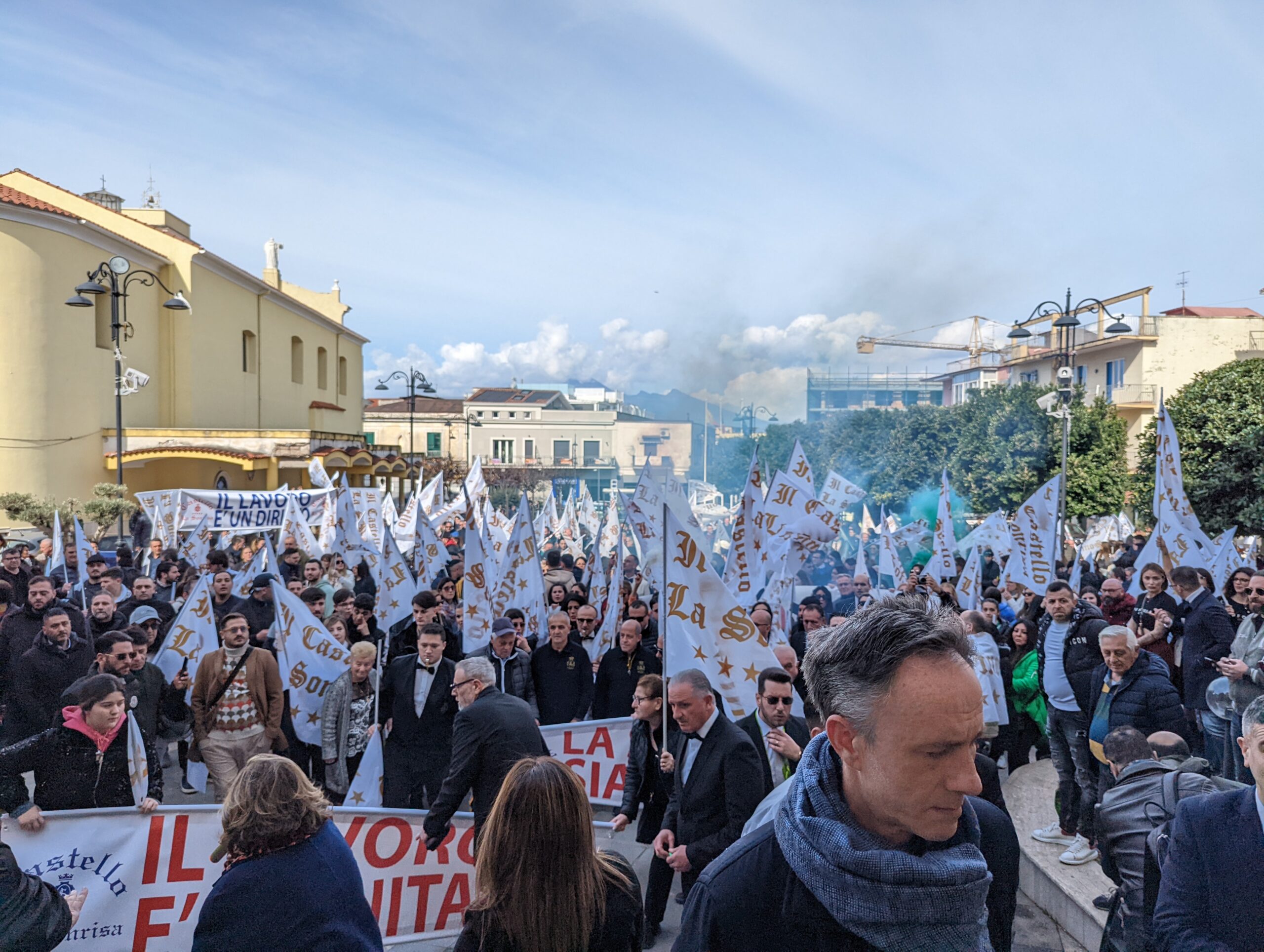 Verso le ore 10:30 il corteo arriva in Piazza don Mosè Mascolo e sosta ai piedi dell’edificio comunale. Una delegazione entra nell’edificio per dialogare col sindaco Ilaria Abagnale. Intanto il corteo si ingrandisce anche con la presenza di alcuni cantanti neomelodici, tra cui Gianluca Capozzi, che hanno lavorato per La Sonrisa.