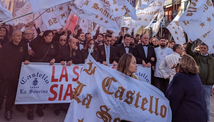Il gruppo di dipendenti in protesta è partito dopo le ore 9, dunque con un po’ di ritardo rispetto all’orario prestabilito. Parte dal castello per arrivare al Comune di Sant’Antonio Abate, ed è costituito dai dipendenti del castello e anche chi ha lavorato per il castello. Non sono stati presenti Imma Polese e il marito Matteo Giordano, ma è stata presente Annapaola Greco, cugina di Imma. Il gruppo ha fatto sventolare le bandiere bianche con su scritto hotel La Sonrisa, il cui colore dorato richiama la ricchezza del castello. Fanno da sfondo i fischi, i fumogeni, parole corali tra cui, «noi vogliamo lavorare!». Anna Lucia Bonavolta, impresaria napoletana di musica, che nel 2014 è stata battezzata da don Antonio Polese «boss delle cerimonie», ha dichiarato: «Aiutiamo queste 250 famiglie perché rischiano di perdere il lavoro». Molti di questi dipendenti sono cresciuti lavorativamente con La Sonrisa, qualcuno dice di aver lavorato 35 anni, e la loro preoccupazione è di perdere il lavoro a causa della sentenza da parte della Corte Suprema di Cassazione. Lo sa bene il cameriere Gaetano Davide, volto noto del programma televisivo «Il castello delle cerimonie» che va in onda sul canale televisivo Real Time, spiega: «Noi siamo dipendenti, lavoratori, noi abbiamo costruito le nostre famiglie su questo lavoro, noi siamo parte della famiglia Polese, che è la struttura portante del castello. Noi dobbiamo lavorare, dobbiamo portare avanti la dignità delle nostre famiglie, noi cerchiamo lavoro al castello. Sapere che il castello non sta con la famiglia Polese, non sta nemmeno Davide». Molti presenti avrebbero voluto vedere in protesta tanti altri personaggi che hanno dialogato con la famiglia Polese, ma non è stato così.