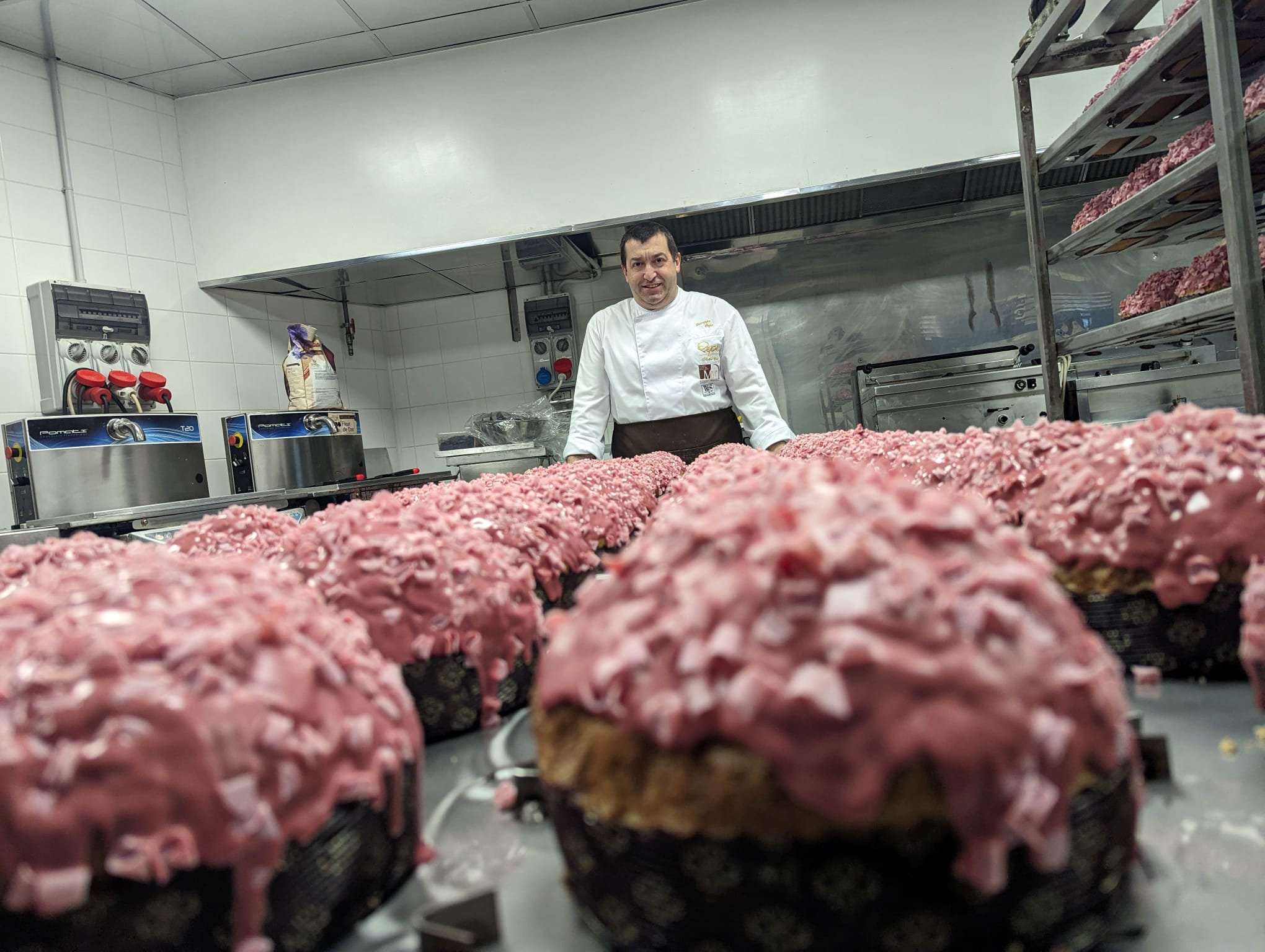 Il maestro dolciere Giuseppe Pepe è nel suo laboratorio mentre sta decorando i lievitati. Sul bancone da lavoro ci sono tante «rose» già completate. Giuseppe ha in mano un lievitato e lo sta immergendo nel cioccolato Ruby poi lo adorna con delicatissimi pezzi di cioccolato.