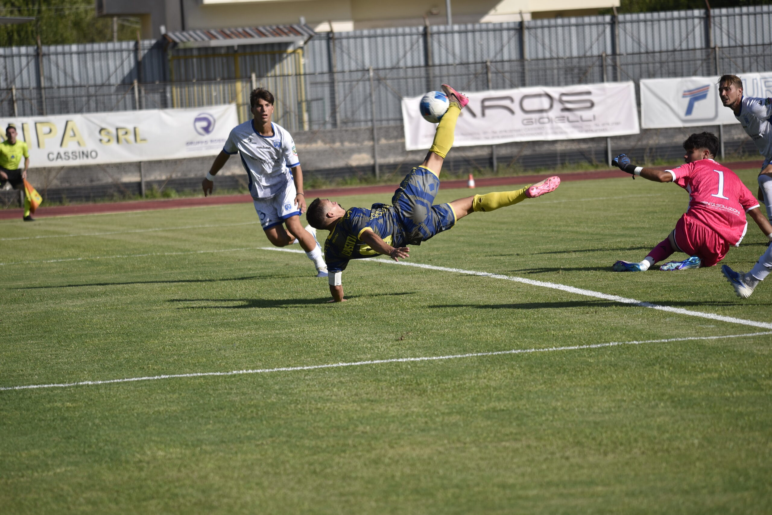 36’ Vantaggio Cassino: bella transizione offensiva dei padroni di casa, cross di Merolla, Sorrentino di testa impatta bene, colpisce in pieno il palo ma è lesto in tap-in a correggere lui stesso a Leonardo battuto per l’1-0