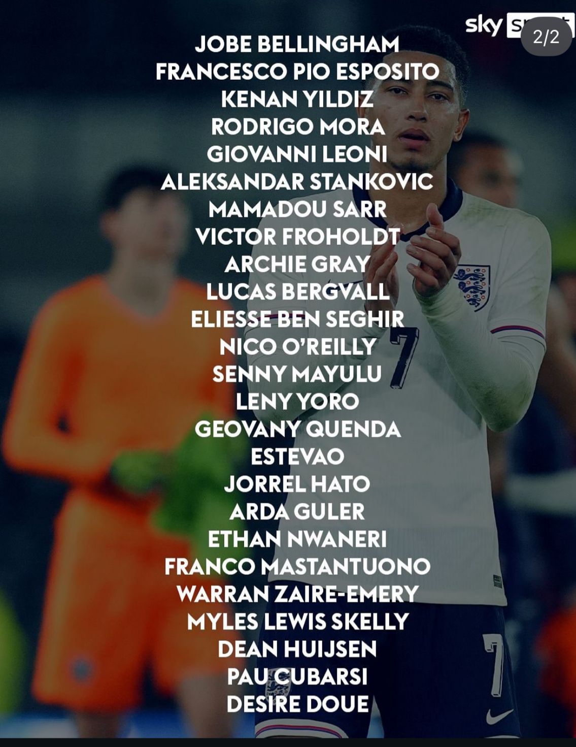 Tra i candidati al premio figurano alcuni dei nomi più scintillanti del panorama internazionale: Pau Cubarsí (Barcellona), Dean Huijsen (Juventus, in prestito alla Roma), Tom Bischof (Hoffenheim) ed Eliesse Ben Seghir (Monaco). Ma i veri favoriti per la vittoria finale, secondo gli addetti ai lavori, restano Estevão Willian del Chelsea, proprio Cubarsí, baluardo della difesa blaugrana, e il baby argentino Franco Mastantuono del Real Madrid.
