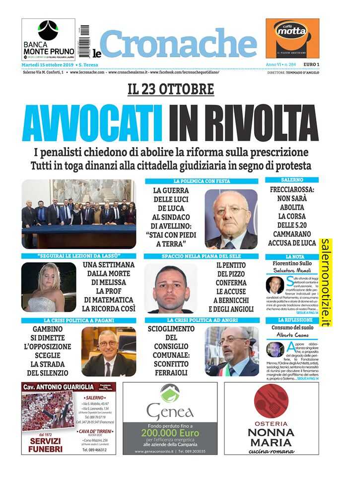 A centro pagina: La guerra delle luci. De Luca al sindaco di Avellino: “Stai con i piedi a terra”.