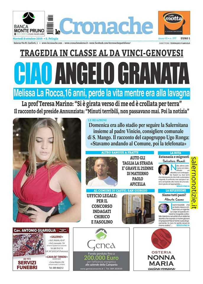Ciao angelo granata. Tragedia in classe al Da Vinci – Genovesi. Melissa La Rocca,16 anni, perde la vita mentre era alla lavagna . La prof Teresa Marino: “Si è girata verso di me ed è crollata per terra”. Il racconto del preside Annunziata: “Minuti terribili, non passavano mai. Poi la notizia”.